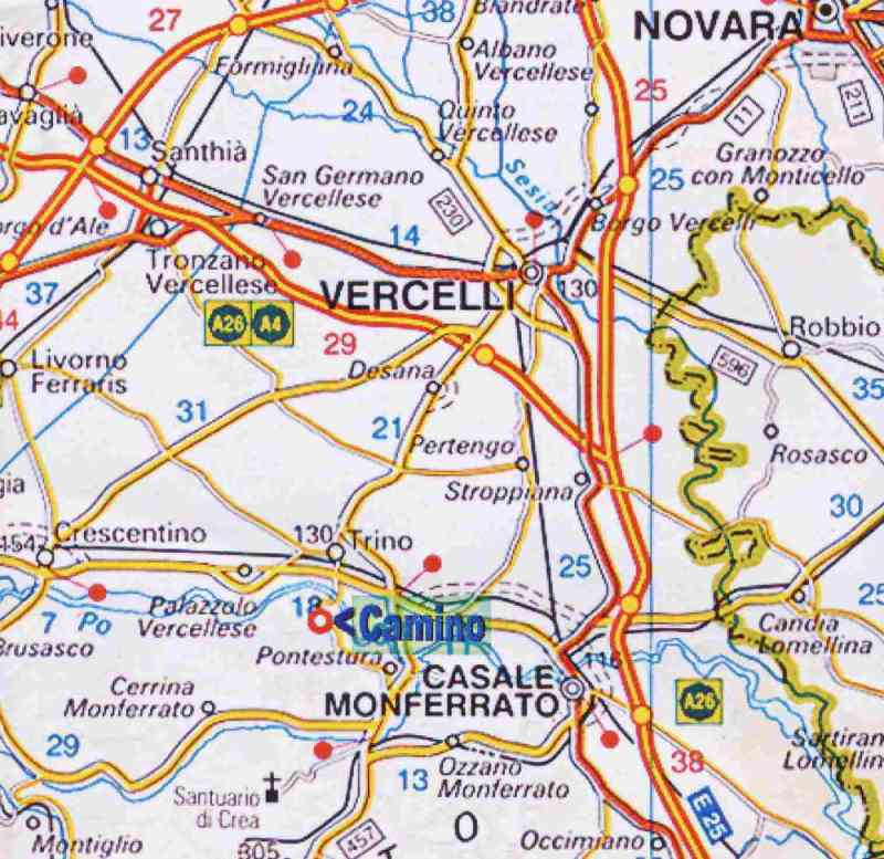 Percorrendo la A4, il paese di Camino si trova a 60 Km da Torino e 90 Km da Milano.